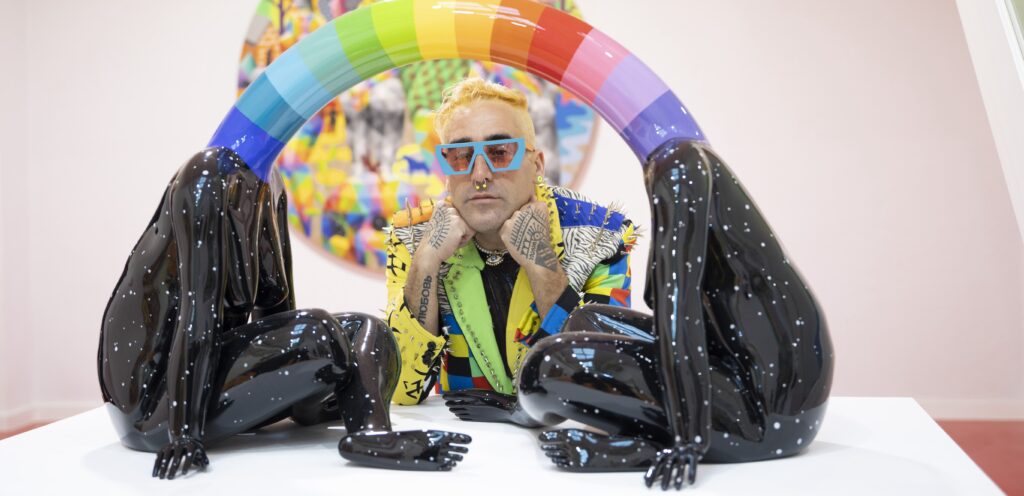 Más allá de las formas, los viajes activan una aproximación a los rituales como experiencias ligadas a lo onírico y lo espiritual, abriendo un espacio de reflexión sobre lo invisible y lo trascendente. En la exposición, estas referencias se traducen en piezas que reinterpretan la máscara desde un imaginario propio, donde el uso del círculo cromático, elemento central y recurrente en la obra de Okuda, resignifica lo ancestral desde una nueva perspectiva.