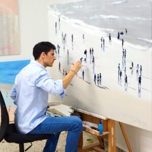 Su obra, realizada principalmente en acrílico, tinta, acuarela y óleo, se centra en la composición como núcleo creativo y en la figura humana, explorando cómo las sociedades contemporáneas influyen en nuestra manera de percibir y relacionarnos con el entorno.
